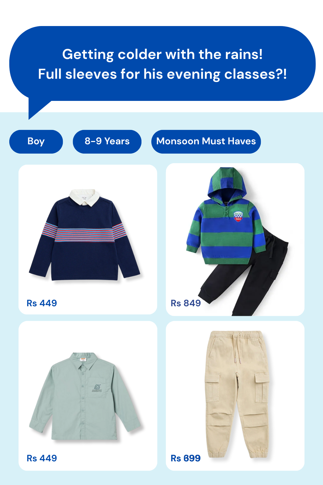 Buy all the clothes you need for your kid, from your home. We bring 25+ options from best brands for you to shop from!